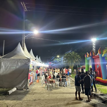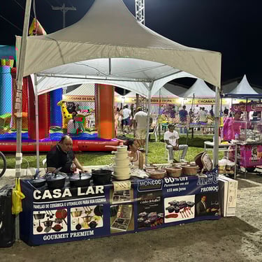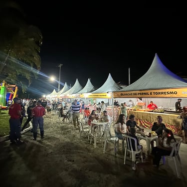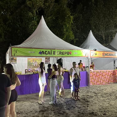 Barracas de comidas típicas operadas por entidades parceiras, com estrutura cedida pela ACCTN para geração de renda social. 😋