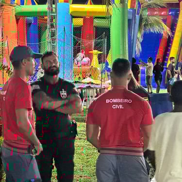 Área sinalizada com brinquedos infláveis e equipe de apoio para a segurança das crianças.